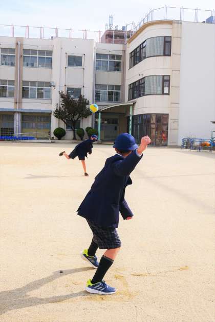運動場で子どもたちは、教室にあるボールやドッジビー、運動場にある一輪車や竹馬を使ってよく遊んでいます。