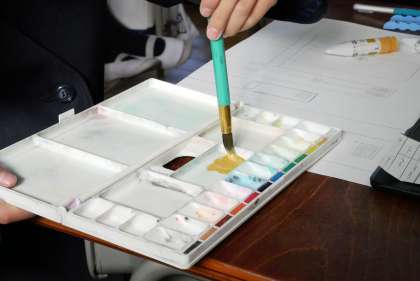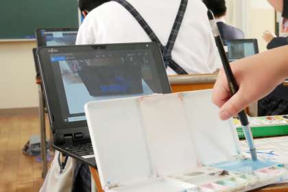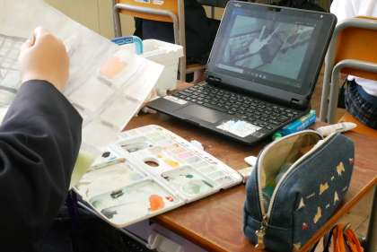五年 図工 公開日 2021/12/16 更新日 2021/12/16 お知らせ 今日は、学校の中の風景を切り取って、絵の具を使って描いています。 以前紹介したクラスでは、学校の周りの風景を描いていましたが、今回はもっと近い教室や教室にあるものから、題材を見つけていました。 教室の中は、周りにある物の色の変化が多く、構図によって難しさが大きく変わります。 子どもたちは、絵の具で微妙な色合いを表現することに挑戦していました。 いいね(0)