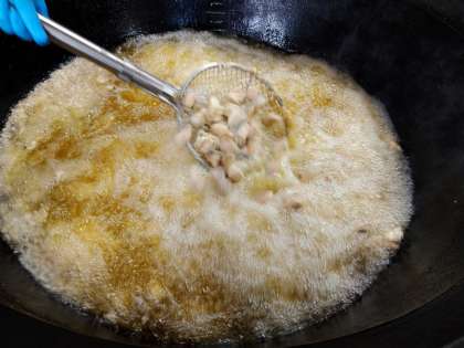給食のさけのマリネでは、オリーブ油でいためたたまねぎ、砂糖、塩、米酢、りんご酢、オリーブ油、ワインで味つけしたマリネソースを、でんぷんをまぶして揚げたさけにからませています。さけがふわっとしていてめっちゃおいしい!と伝えてくれた児童もいました。