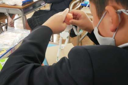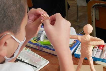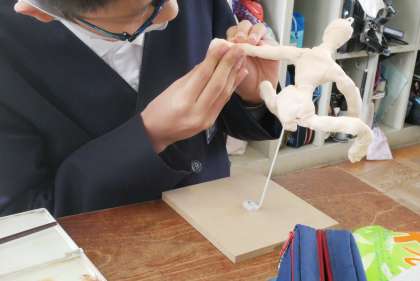 白い紙粘土に、黄色や茶色の絵の具を混ぜて、肌色の紙粘土をつくり、骨格となる芯材へ貼り付けていきます。