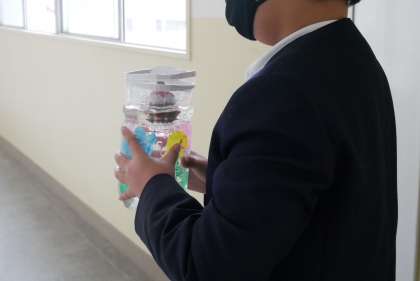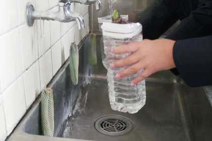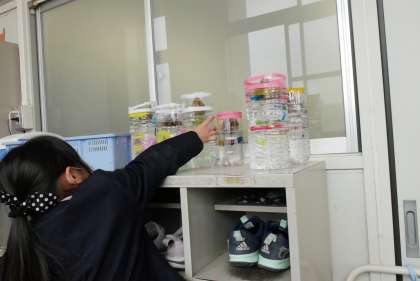 2年生の教室の前の下駄箱の上には、ヒヤシンスの球根が並んでいます。