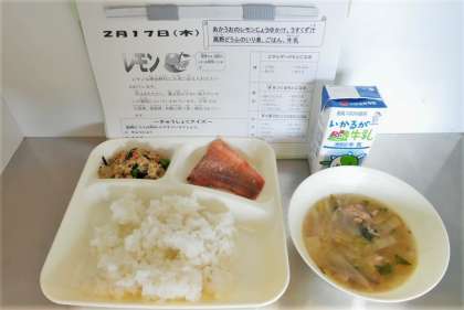 2/17(木)の献立 公開日 2022/02/18 更新日 2022/02/18 お知らせ 2/17(木)の献立は、 〇 あかうおのレモンじょうゆかけ 〇 うすくず汁 〇 高野どうふのいり煮 ○ 米飯 〇 牛乳 でした。 本日の献立には、高野どうふの粉末を使った米飯によく合う味つけの高野どうふのいり煮、国産のレモン(広島県)を使ったあかうおのレモンじょうゆかけが登場しました。どちらも児童に大人気でした。味の組み合わせも良く、どの学級もとてもよく食べていました。 いいね(0)