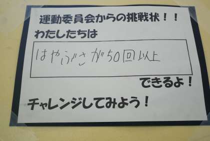 運動委員会からの挑戦状 公開日 2022/03/01 更新日 2022/03/01 お知らせ 6年生の運動委員から、全校児童に向けて挑戦状が廊下に張り出されていました。 「鉄棒」「うんてい」「縄跳び」などの技の記録が書かれていて、どれも簡単にはいかないものばかりです。 ぜひ挑戦して、記録を塗り替えてほしいです。 いいね(0)