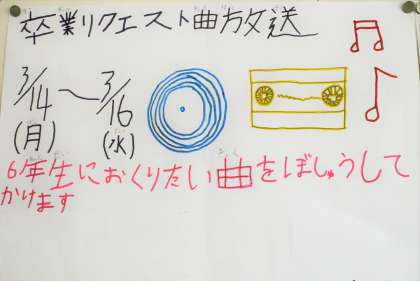 卒業リクエスト曲の放送 公開日 2022/03/15 更新日 2022/03/15 お知らせ 14日から16日の朝の登校時間に、放送委員会がみんなから募集した「六年生に送る卒業リクエスト曲」を流しています。 いつも流れている曲とは違い、最近の流行曲が多く流されています。朝の登校時から、六年生を送り出す雰囲気を盛り上げています。 いいね(0)