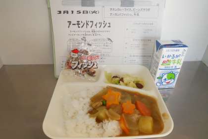 大池小学校の人気献立投票で断トツの一位に選ばれたのがカレーライスです。6年生は、小学校生活最後のカレーライスでした。ラッキーにんじんはいつもの星形だけでなく桜型もそえられていました。今日を含めて後3回となった小学校での給食、しっかり味わってほしいと思います。