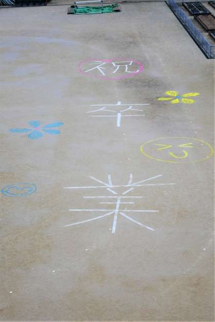 ちょうど6年生の教室から校庭を見下ろした位置に、おおきな「祝・卒業」の文字が書かれています。