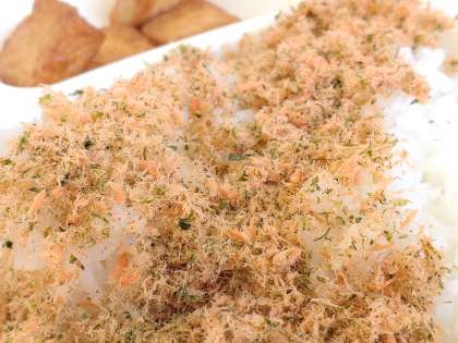 紅ざけそぼろは、紅ざけ(フレーク)にいりごま、あおのりを加えて風味を増した、手作りのふりかけです。素材の味と彩りをいかすため、料理酒、みりん、うすくちしょうゆのみで味つけしています。骨がなく食べやすいため、魚が苦手な児童にも人気の一品です。