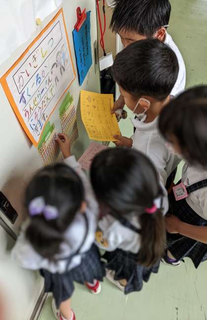 本日は、いよいよ学校探検本番でした。先生方は先導せず、2年生が「並んで〜」「こっちだよ」と優しく1年生に声をかけ、