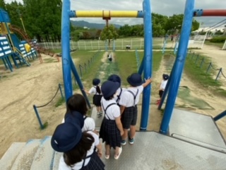 雨も上がり、花園中央公園に到着しました。公園内を散策し、少し早めにお弁当を食べた後、遊具で遊んでいます。