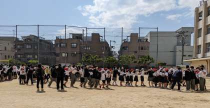 小学3、4年生は、中学2年生と「じゃんけん列車」をしました。小中入り交じって長〜い列車になっていく様子が楽しかったようで、笑顔が連なっていました。