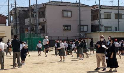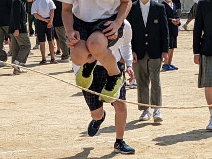 小学5、6年生は中学3年生と「大縄8の字跳び」をしました。中学生の回す大縄はとても跳びやすく、どの子も上手に跳べていて楽しそうでした。