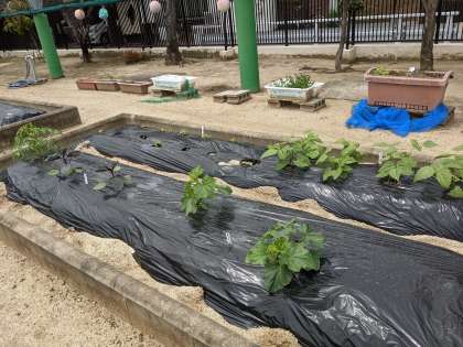 運動場の端にある学習園には、夏野菜のナス、キュウリ、カボチャ、トウモロコシ、メロン、スイカ、インゲンマメや、夏を代表する植物のヒマワリが植えられています。