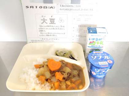 大阪市の給食では、様々なバリエーションのカレーライスが登場します。今月は、大豆を使ったカレーライスが登場しました。