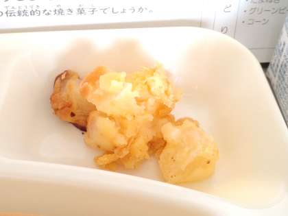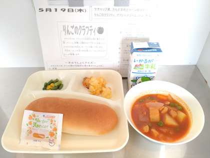 今日の給食では、コーンフレークを敷き詰めた上に、卵、クリーム、砂糖、小麦粉、りんご(カット缶)を混ぜたものを流し入れ、蒸し焼きにしたりんごのクラフティが登場しました。給食では、このような手作りデザートも登場します。