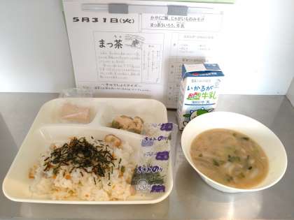 手作りデザートのまっ茶ういろうが登場しました。まっ茶ういろうは大池小学校でも大人気のデザートです。市販品とは違い、添加物は全く使用せずに給食室で手作りしています。今年からきな粉をふりかけて食べるようになりました。初めてういろうを食べた1年生の教室では「初めて食べたけどめちゃくちゃおいしい!」と言ってくれる児童もいました。