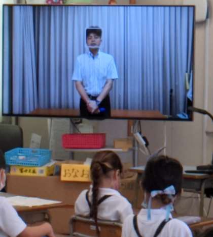 あいにくのお天気でしたので、児童は教室でお話を聞きました。