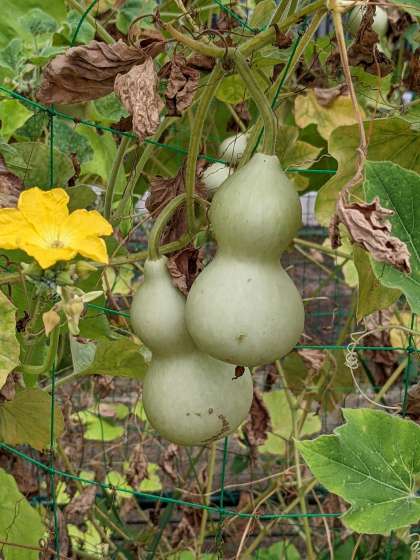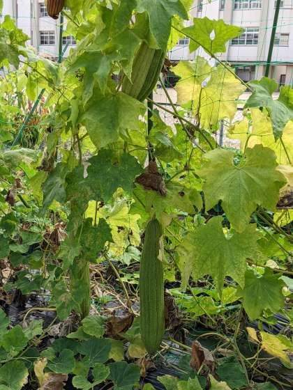 夏の野菜の収穫が終わった学習園では、へちまや瓢箪が実っていました。