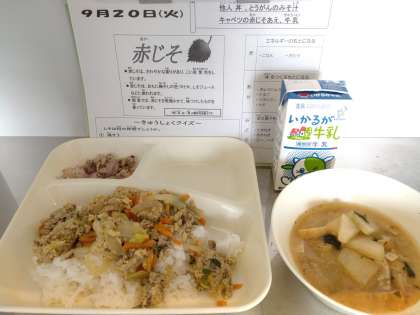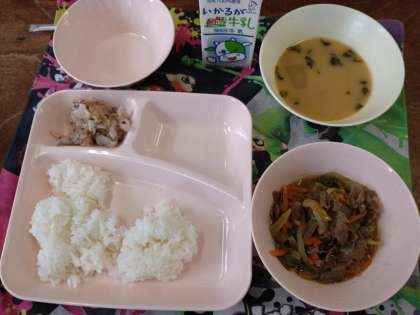 本日の他人丼は、個別対応給食(除去食対応献立)でした。卵アレルギーの児童も食べることができるように液卵を入れる前に取り分けたものを提供しています。一目で分かるように食器も通常の食器と違いピンク色の食器を使用しています。