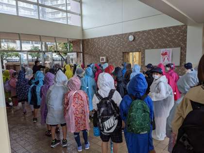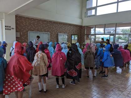 カッパを来て傘をさして歩くので、列が伸びないように、声が聞きにくくなるのでいつもより注意して話を聞きましょうという校長先生のお話もしっかり聞いていました。明るい3年生は雨でもきっと楽しんで来ることでしょう。行ってらっしゃい!