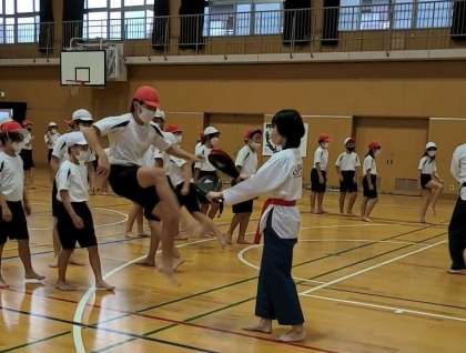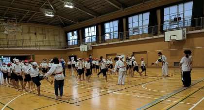 何度もお手本を見せてくれたり、丁寧な指導や励ましの言葉をかけていただき、児童は真剣に難しい蹴りの練習に取り組んでいました。自ら手を挙げ、先生にコツを聞いている児童もいました。最後に先生が「基本が大事。基本が出来たらなんでもできる。テコンドーだけじゃない、何事も基本」と仰っていたのが印象的でした。児童は「難しかったけど、楽しかった!」と笑顔で感想を述べ、1人ずつ中学生コーチにお礼をしていました。