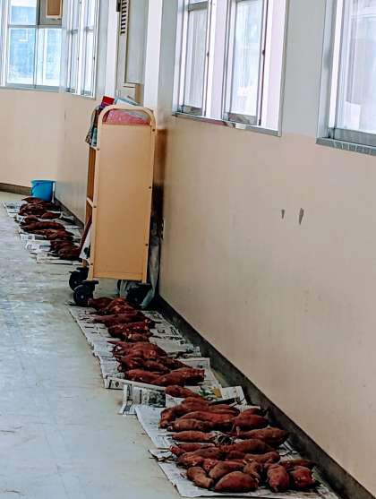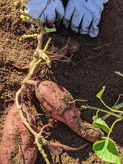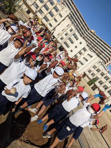 2年生が芋堀をしました。楽しみにしてはいましたが、土の中にあるさつまいもはどれだけ成長しているのか分からず、掘り起こすまでドキドキワクワク。なかなか姿を見せてくれず、軍手をドロドロにしながら小さな手で一生懸命に掘っていました。「あ!あった!」「見て!めっちゃおっきい」「深いわ〜。なかなか出てこない」「いっぱい繋がってる」「虫おる〜」など発見がいっぱいでした。甘く美味しくなるように廊下で乾燥させます。2週間後が楽しみです。