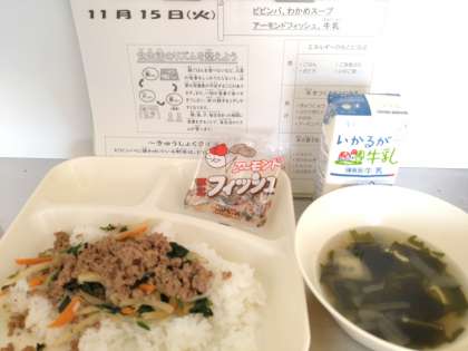 大池小学校で大人気の献立、ビビンバが登場しました。今年度は、4月と11月に登場しました。4月は切り干しだいこん、11月はほうれん草を使ったビビンバとなっています。
