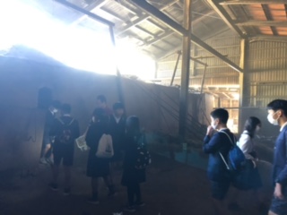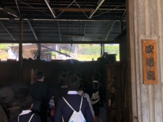 炭を作る窯を見学しました。ひんやりしていて、炭のにおいがしました。窯の中にも入らせていただきました。貴重な経験を終えて出てくると、みんな炭だらけになっていました。
