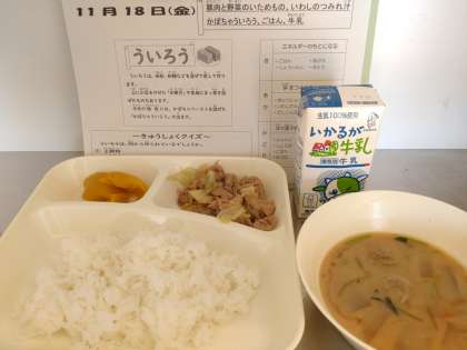 給食のかぼちゃういろうは、かぼちゃペースト、上新粉、砂糖、水を混ぜ合わせ蒸して作っています。大池小学校で大人気のういろう。昨日は、「私のクラスだけ倍にしてください」や、今日は「どうやって作るのか教えてほしい」という声が聞かれました。