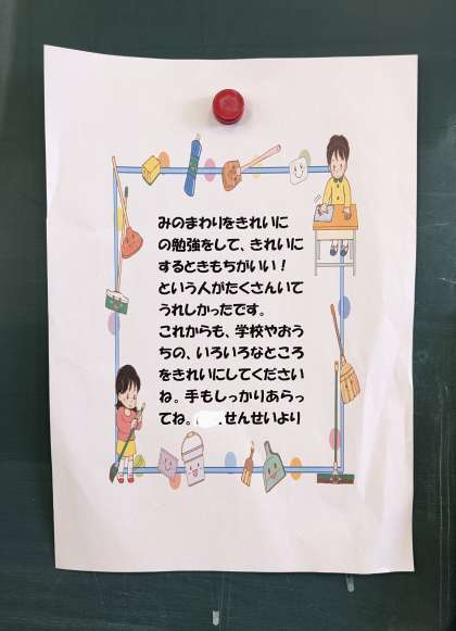 身の回りをきれいに 公開日 2022/12/02 更新日 2022/12/02 お知らせ 2年生が【身の回りをきれいに】という勉強をしました。学校では、おいもパーティーの前に家庭科室の机をきれいに拭いたり、家では自分で決めた場所を1週間すすんできれいにしました。「きれいにするととても気持ちよかった」「これからもきれいにしたい」という感想が多かったです。保健の先生から賞状をいただきました。これからもすすんで色々な場所をきれいにして、気持ちよく過ごしましょう。 いいね(0)