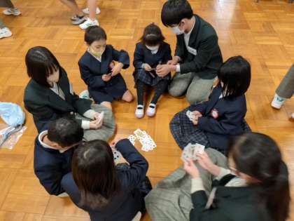 中学3年生と小学校1・2年生との交流会がありました。1・2年生は「大っき〜」「カッコイー!」と、とても嬉しそうな声を上げていました。中学3年生は、少し恥ずかしそうでしたが、事前に家庭科の授業で幼い児童との関わり方を勉強したこともあり、とても上手に声掛けをしていました。「きれいに気をつけができるのは誰かな〜」と声をかけるといつもはおしゃべりしたりゴソゴソと動く1年生もピシッと素早くきれいに並びます。次は何を言うのかな?という目でじっと中学生の方を見ていました。1・2年生のリクエストに応えて、それぞれ違う遊びをしましたが、どのグループの中学生も相談しながら小学生を楽しませてくれていました。小中学生みんなの笑い声が教室、体育館、多目的室からあふれていました。