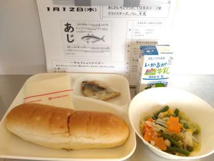 給食のあじのレモンマリネは、下味をつけて揚げたあじに国産レモンからしぼったレモン汁を使用したマリネ液をからませています。