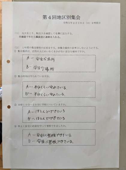 これらを踏まえて、新しい班長と副班長の抱負は、【決められた時間内に事故のないように安全に来れるように頑張ります】というものでした。