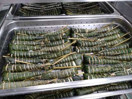 給食のちまきは、原材料はすべて国産で、一般的に市販されているものより糖分をひかえたものです。笹は新潟県産を使用し、米粉などで作ったもちを熟練の職人が1本ずつ手で巻いて仕上げています。