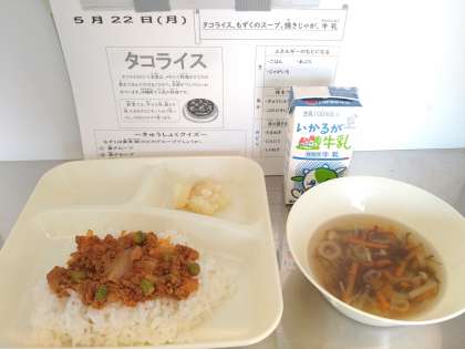 給食のタコライスは、牛ひき肉、豚ひき肉、たまねぎをいため、カレー粉、トマトピューレ、ケチャップ、ウスターソースなどで味つけをし、最後にグリンピースを加えた具をご飯にかけて食べます。低学年の児童には混ぜてもおいしいよ。と声をかけると混ぜてから美味しそうに食べていました。