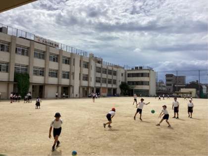 休み時間には、校庭に多くの児童の姿がありました。今日は、日差しが少く比較的気温が低かったので、外遊びができ、ボールやフリスビー、一輪車を使って元気に体を動かしていました。