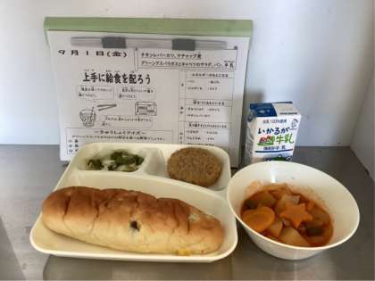 暑い中、調理員さんが、カツを揚げてケチャップ煮を作ってくださいました。ケチャップ煮には、ラッキーにんじんが入っていました。やはり当たると嬉しいですね。