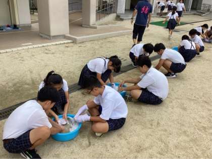 それぞれが持ってきたくつ下を、たらいの水(洗剤入り)でゴシゴシ洗いました。