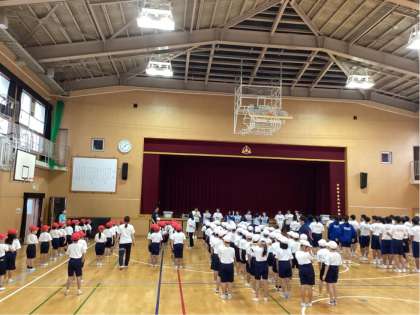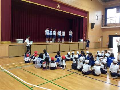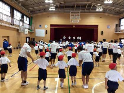 小中児童生徒が入り混じって「指示ゲーム」を行いました。指示に従って、手をつないだまま、前後左右に字ジャンプします。途中、指示とは逆に動くルールになったとたん、間違うグループが続出しました。