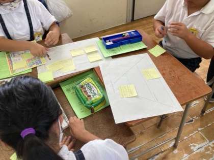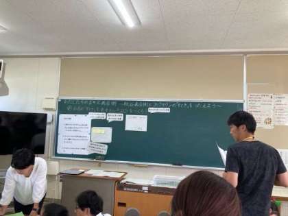桃谷商店街とコリア夕ウンの見学を通して発見したことや思ったこと、考えたことを整理してまとめたものをもとにして、店の特色やよさを表すキャッチコピーを考えています。熱心に話し合いを行っていました。