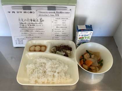 お月見を代表する飾りといえばススキや月見団子が思い浮かべますが、今日の給食では丸いみたらし団子と丸いがんもどきの煮物が登場した行事献立でした。