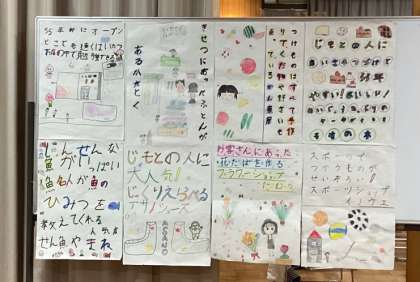 これまでの学習の中での見学やインタビューを通して、お店で働く人々の思いや工夫を知ることができました。それをグループで話し合い、まとめ、各お店の「すてき」を発信するキャッチフレーズ作りに取り組んできました。