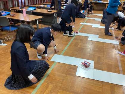 2つのパラメーターを増減させることで、移動や静止、回転などを指示することができ、それをつなげることで、様々な動きをプログラミングします。なかなか思うように走ってくれませんでしたが、子どもたちの目は輝いていました。