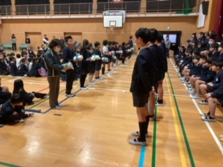 6年生からは、各学級に自分達がで縫った雑巾が贈られました。
