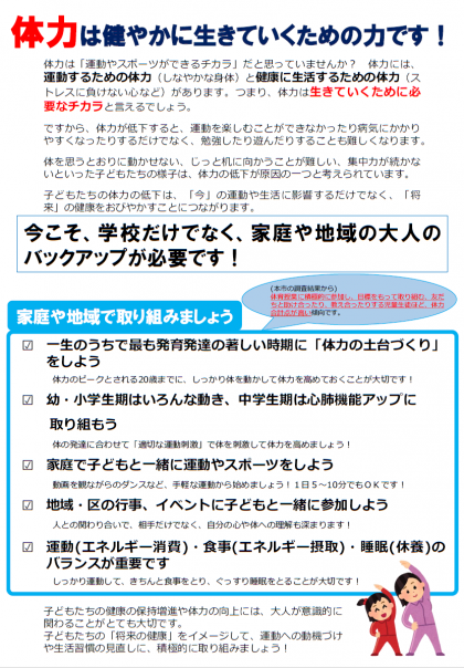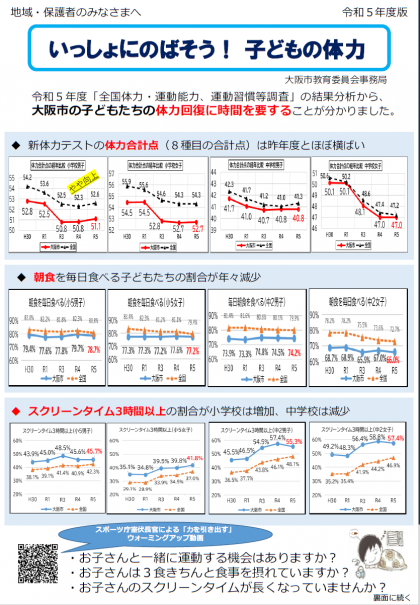 教育委員会といたしましては、子どもたちの体力向上には、学校・家庭・地域が連携して取り組むことが重要と考えております。つきましては、大阪市の子どもたちの力を伸ばすために大切なことをまとめたリーフレットを作成いたしましたので、ご覧いただき、生活の中で活用・実践いただければ幸いです。