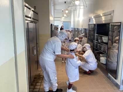 一年生は少し早く給食の準備を始めています。先生や調理員さんの声がけで、食器、食缶や牛乳かごを頑張って教室まで運びました。みんな少し緊張した面持ちでしたが、しっかり並んで教室まで運べていました。
