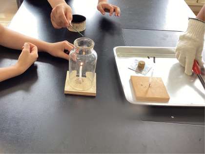 これまでの学習や生活体験をもとに、予想や仮説を立て、4つのパターンの実験を行いました。今回の実験は火を使うため、安全チェックもしっかり行いました。