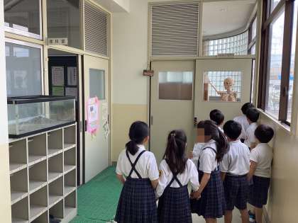 理科準備室からガイコツが手を振っていましたね。理科室は4年生から使い始めます。