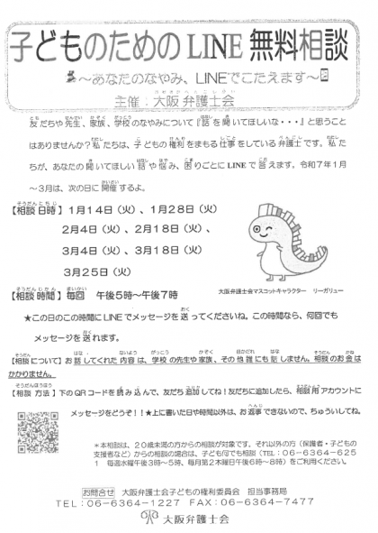 子どもたちのなやみやこまりごとにLINEで弁護士がむりょうでこたえてくださいます。くわしいことはこのちらしを読んでください。