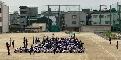 校庭に避難完了後、校長先生から日頃の避難訓練の大切さについてのお話を聞きました。