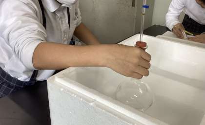 理科室で「とじこめた空気に温度の違う水をかけると?」の実験を行いました。